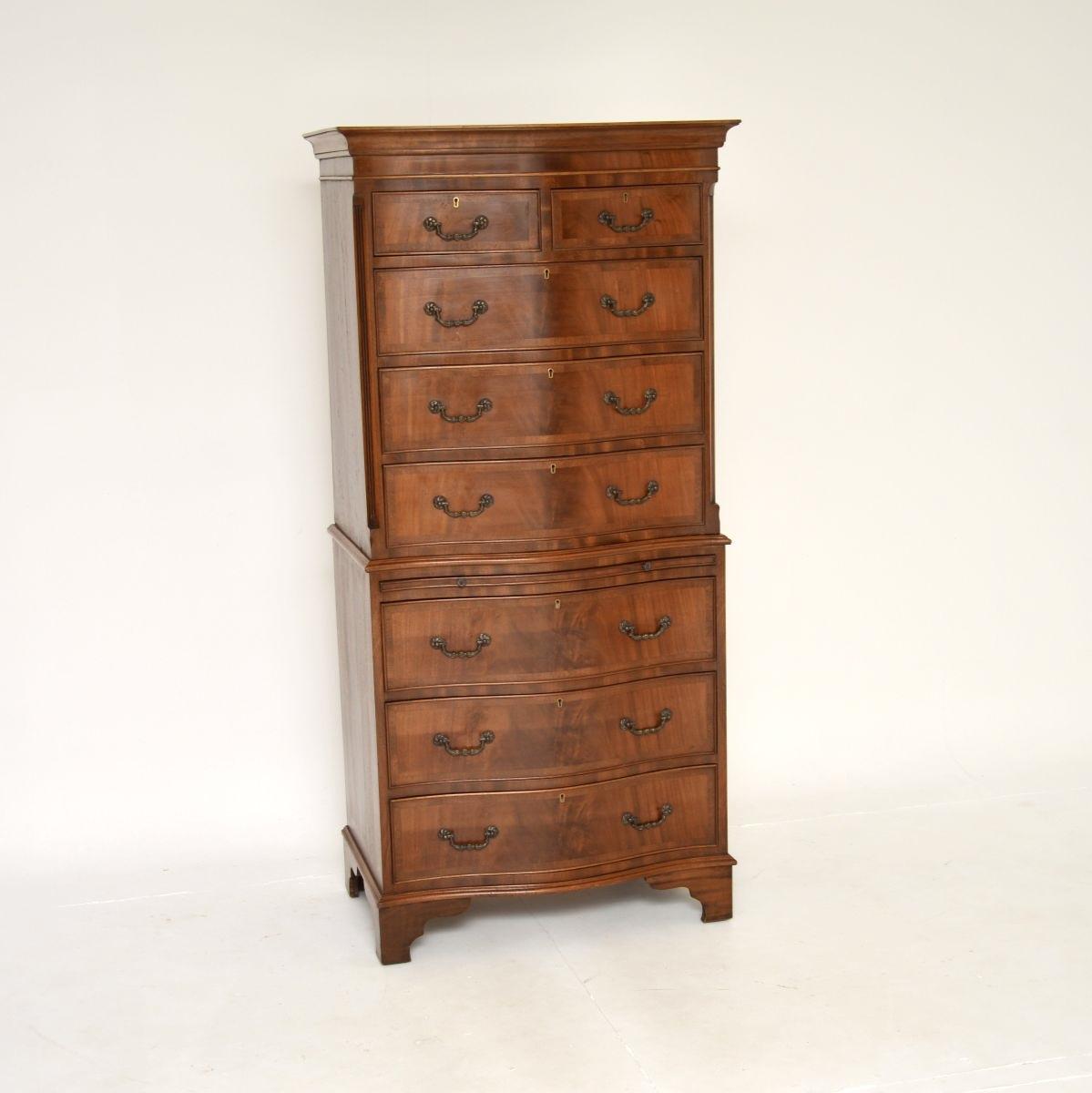 An impressive and very well made mahogany serpentine chest on chest of drawers. This is in the antique Georgian style, and it dates from around the 1930s.