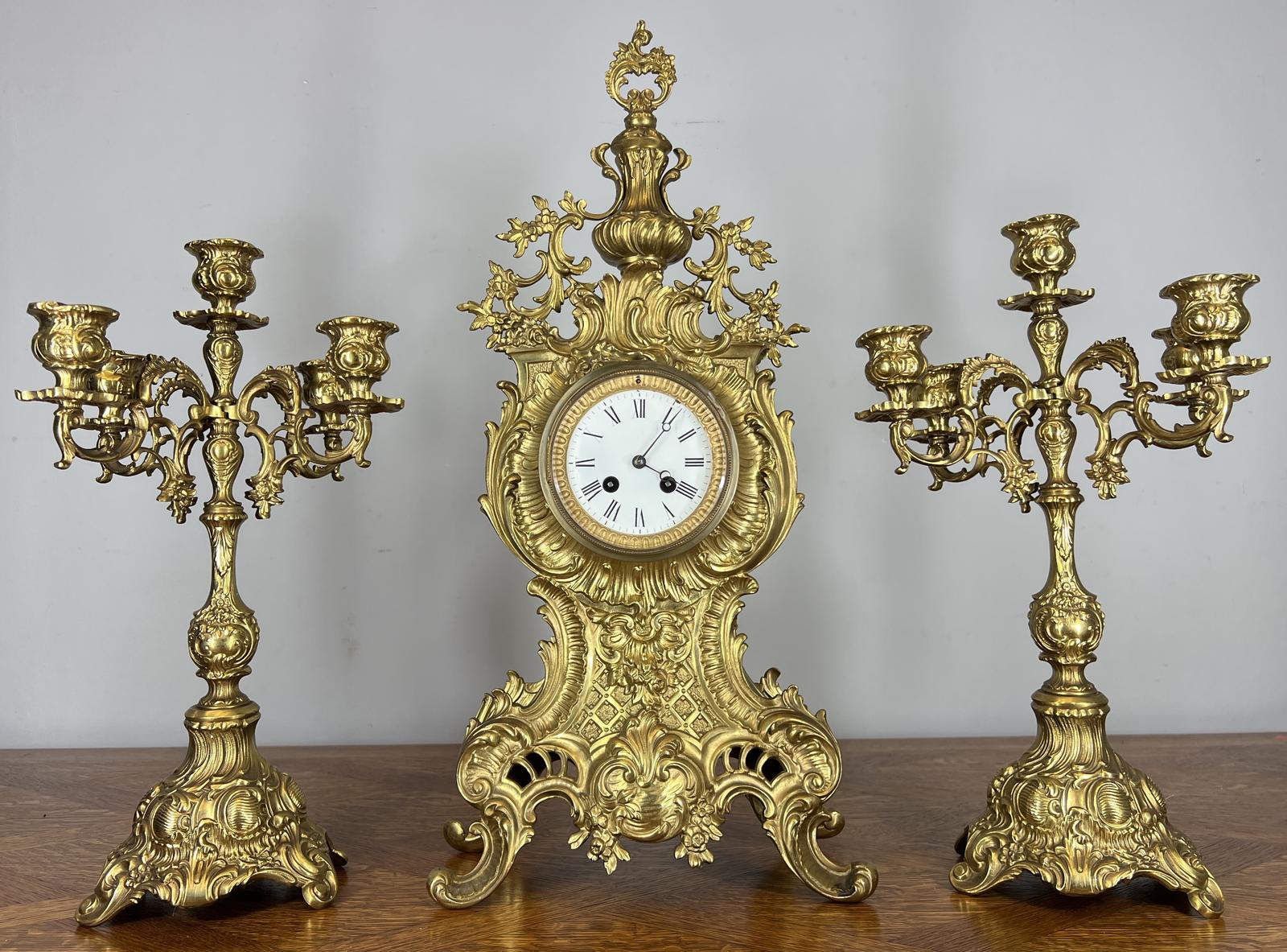 Mantel Clock Antique French Rococo Revival Gilt Bronze Set