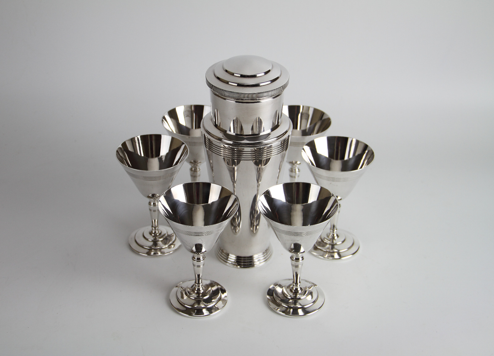 Mappin & Webb Silver Plated Cocktial Shaker with Six Matching Cocktail Cups Designed by Keith Murray