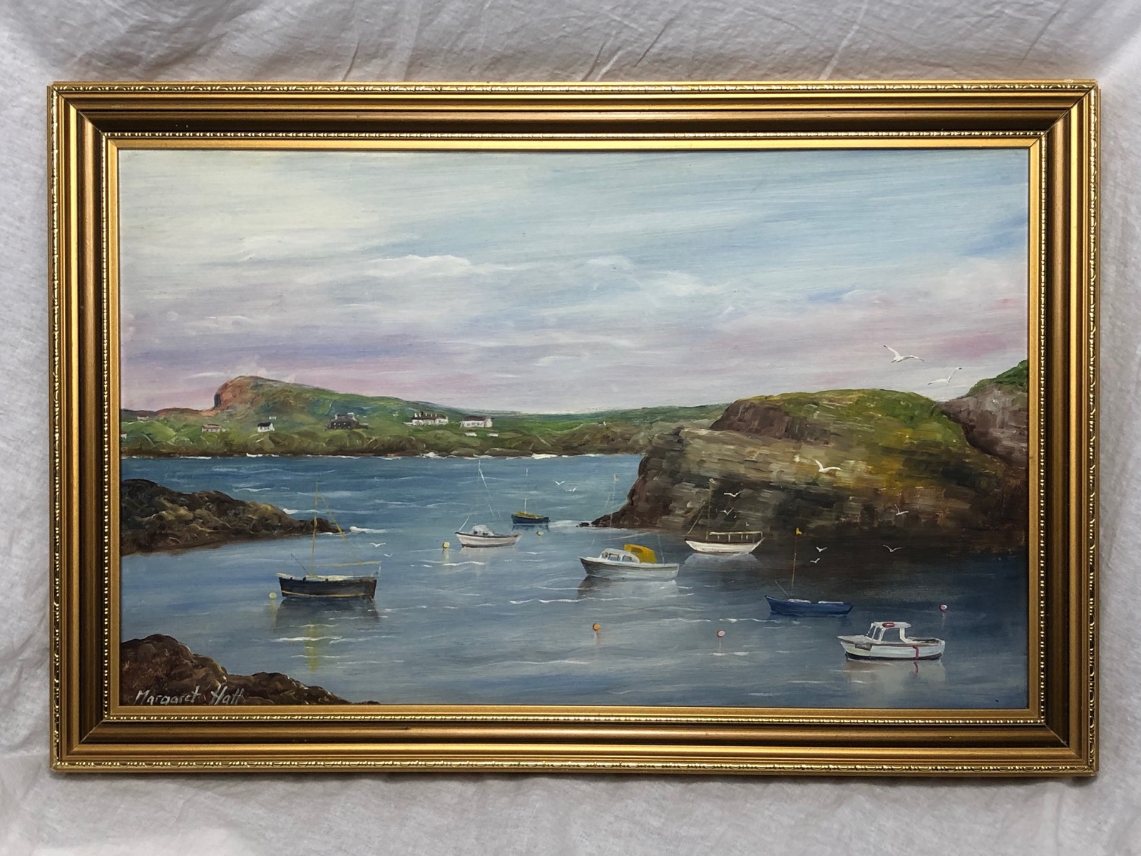 Marine Oil Painting Fishing Boats Anglesey Bay Coast Wales Listed Margaret Hall