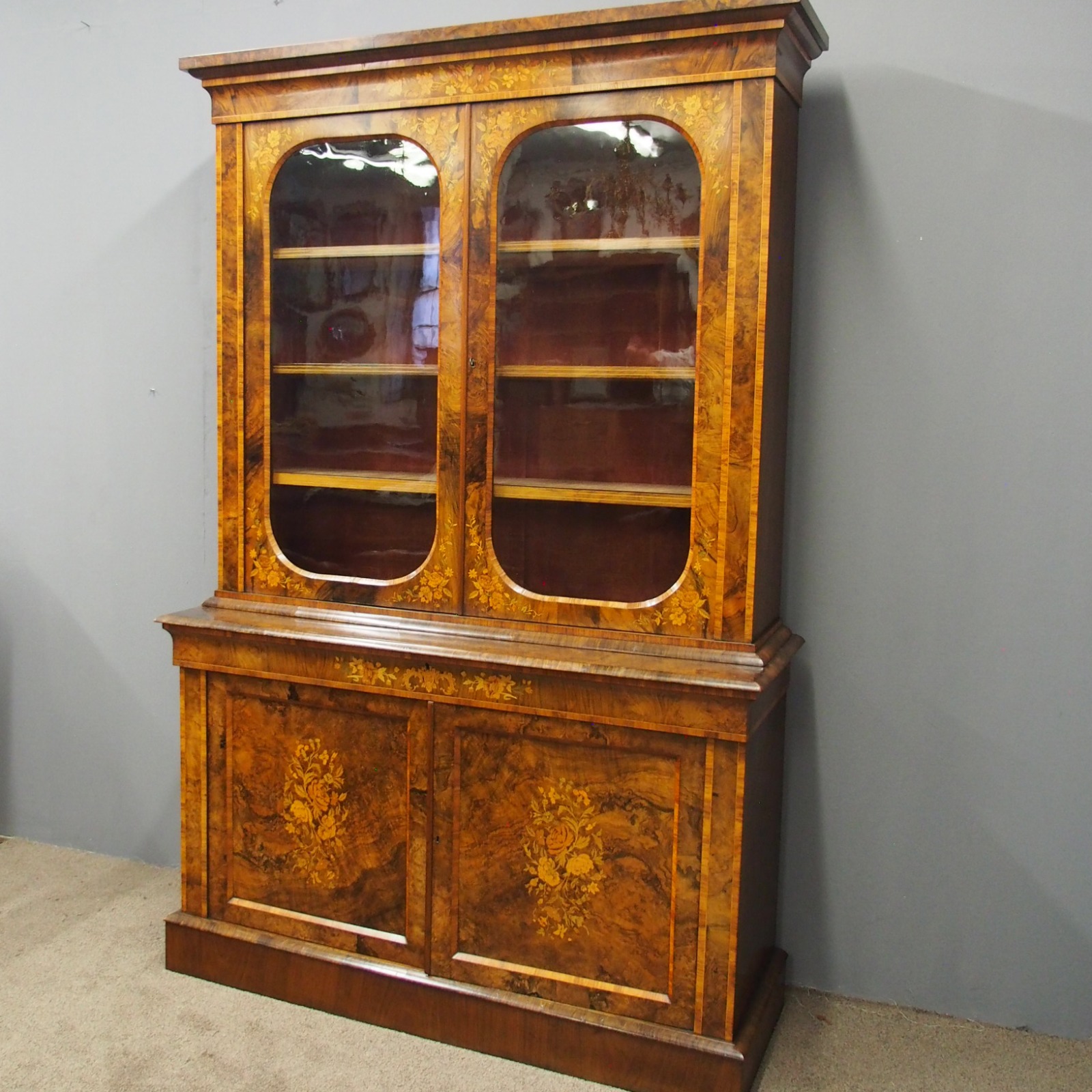 Marquetry Inlaid Burr Walnut Cabinet Bookcase