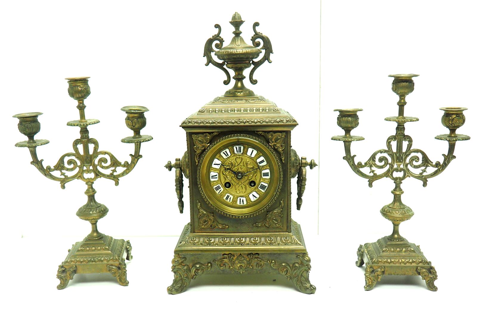 Marvellous French Bronze Candelabra Carved Decoration 8 Day Mantle Clock