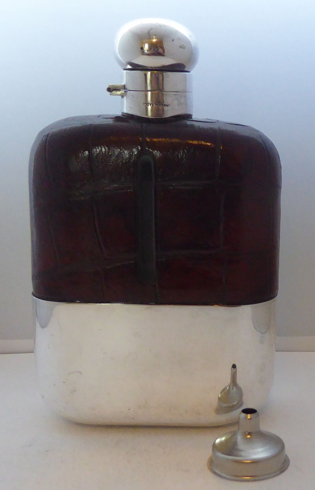 Massive James Dixon 1 Pint 1930s Silver Plated Crocodile Skin Bound Glass Hip Flask