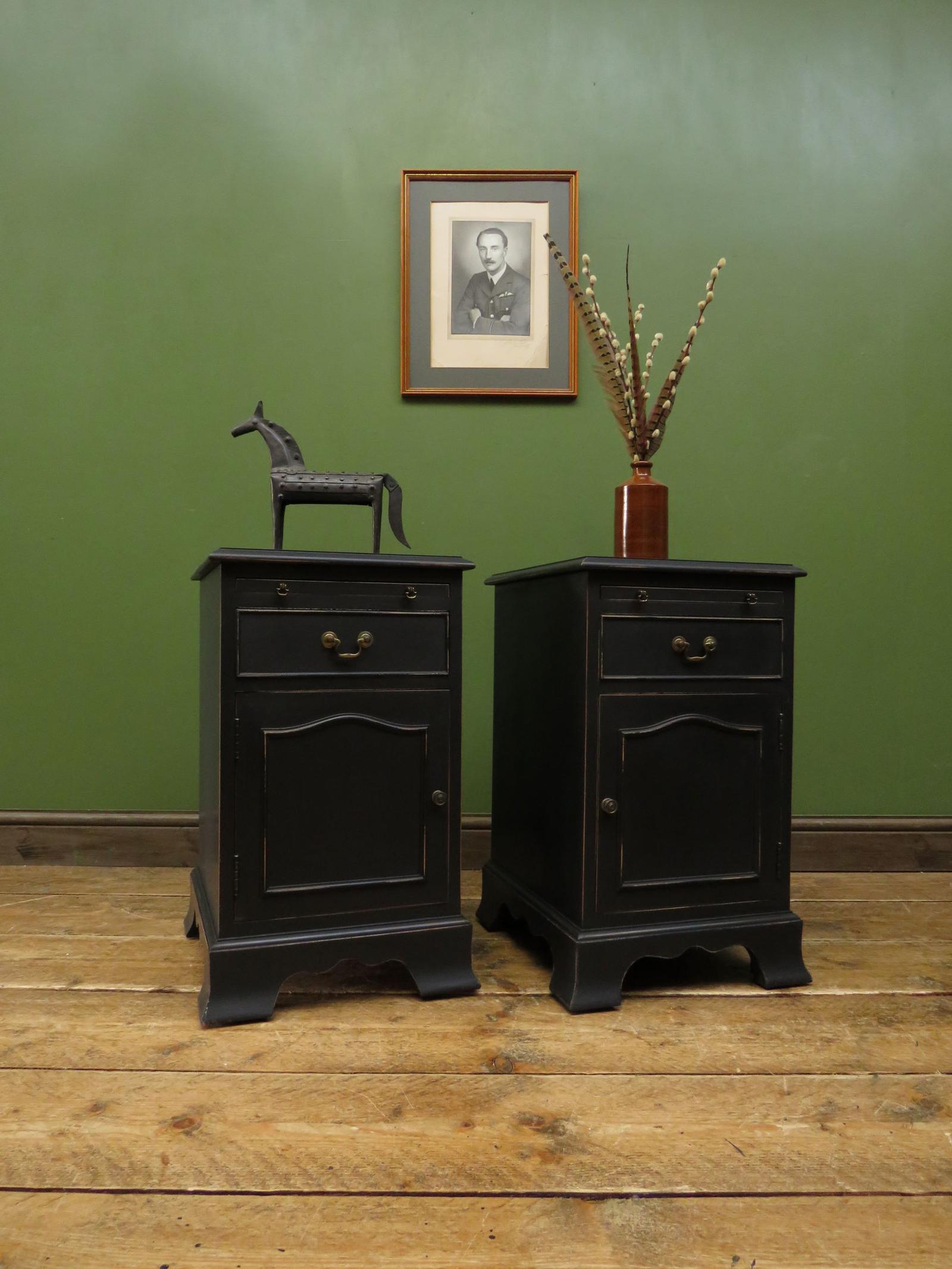 Matched Pair of Black Painted Bedside Cabinets, Gothic shabby chic