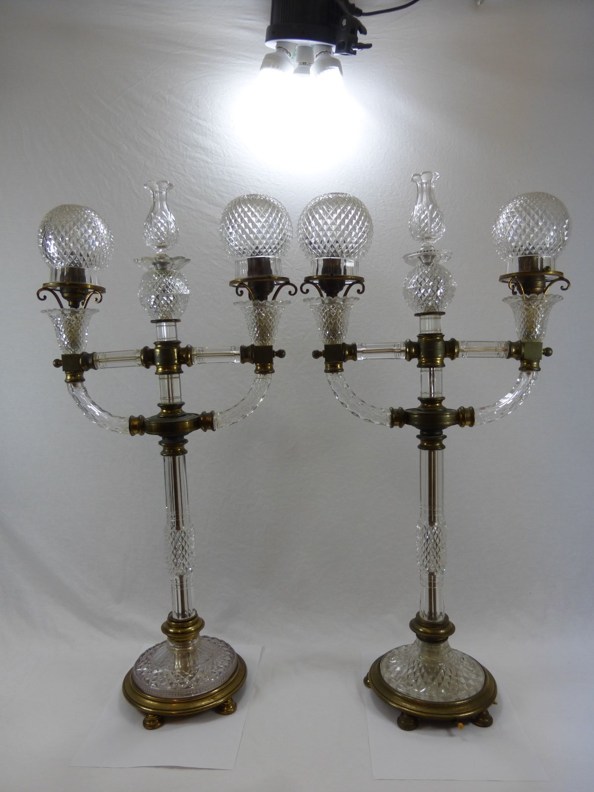 Matched Pair of Early Electric F.C. Osler Cut Glass Crystal Candelabra Lamps Lights