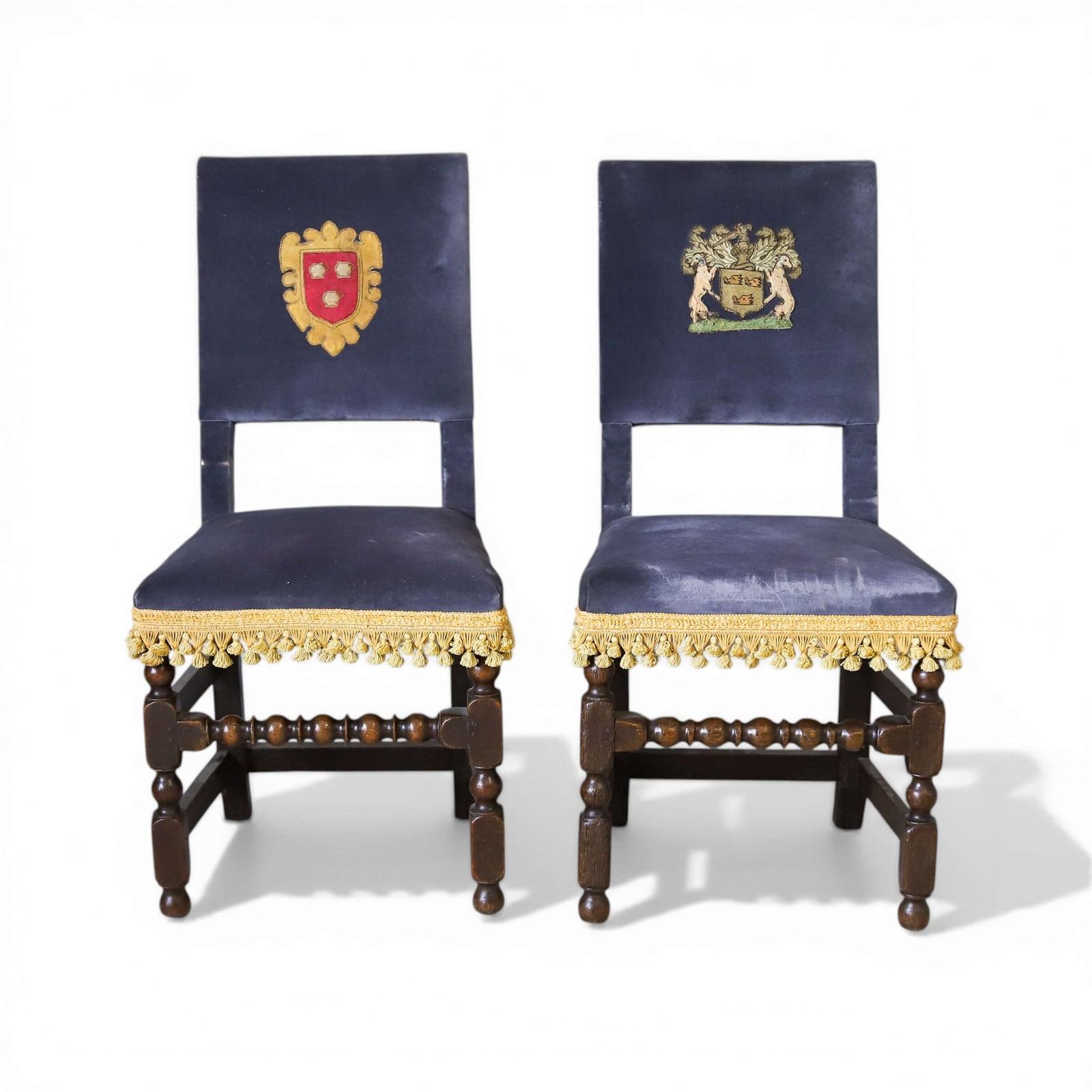 These chairs offer a tangible connection to that world: a time when seating was not merely practical, but a statement of presence and belonging. Their survival as a matched pair is remarkable, and their layered history - early oak frames, later velvet, period crests - adds depth and authenticity.
