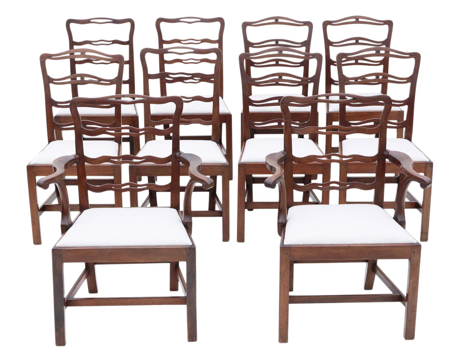 Matched Set of 10 (8+2) Mahogany Georgian C1825 Dining Chairs Ribbon Back