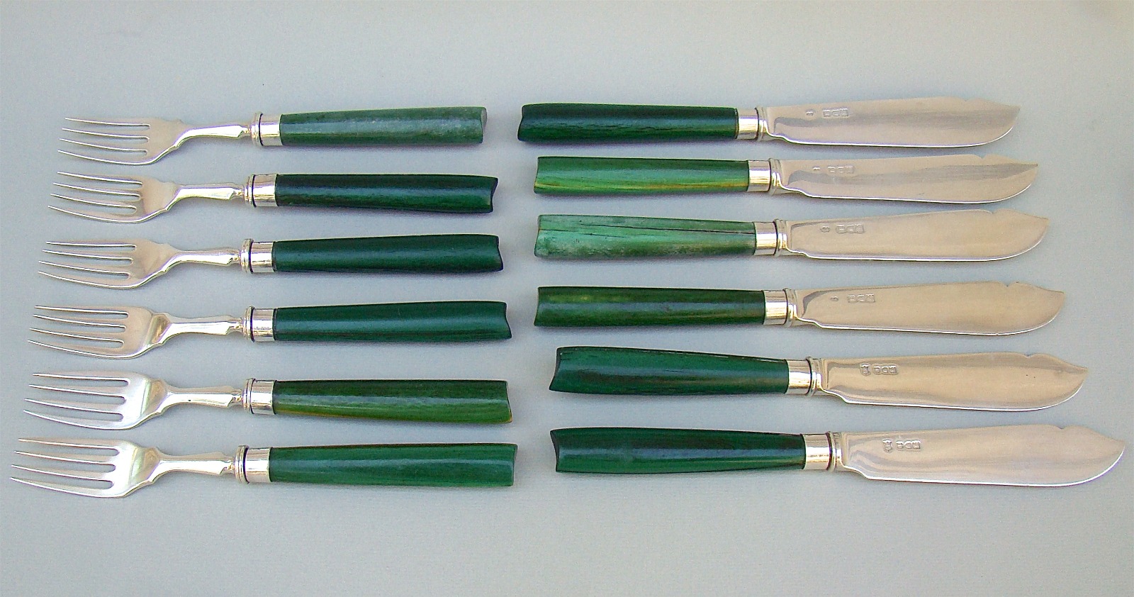 Matched Set of Six Solid Silver & Stained Green Bone Fish Knives & Forks by Bradbury & Charlie Jacques, London 1906 & 1912