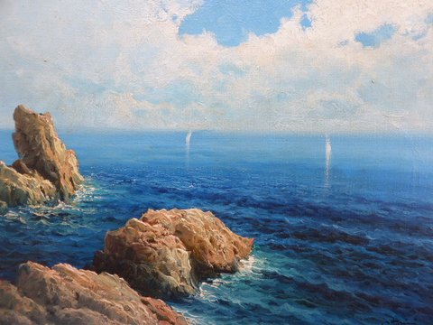Mediterranean Seascape Oil Painting on Canvas in Painted Gallery Frame (22 X 18 inches)