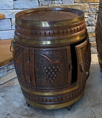 Medium Carved Oak and Brass Barrel Wine Cabinet