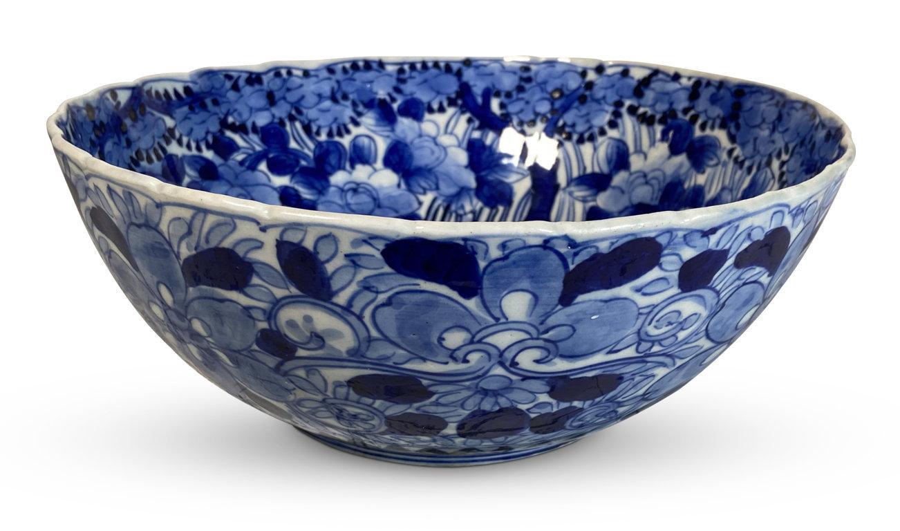 Meiji Period Blue and White Floral Decorated Bowl with Scallop Edge