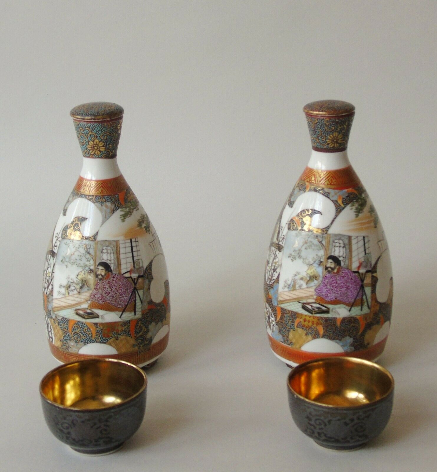 Meiji Period Japanese Kutani Porcelain Saki Bottles & Cups