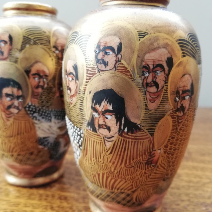 Meiji Period Japanese Satsumaware, Handpainted Miniature Vases with Immortals