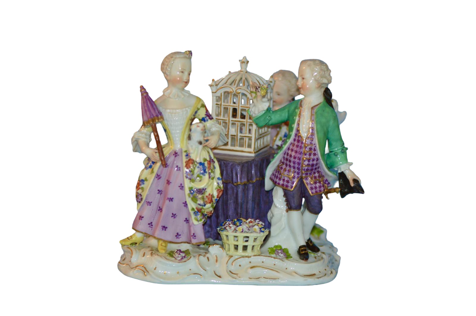 Modelled with a young man offering flowers to a girl while a third figure is seated playing a pipe, all surrounding a caged songbird on a scroll base. Crossed swords mark.