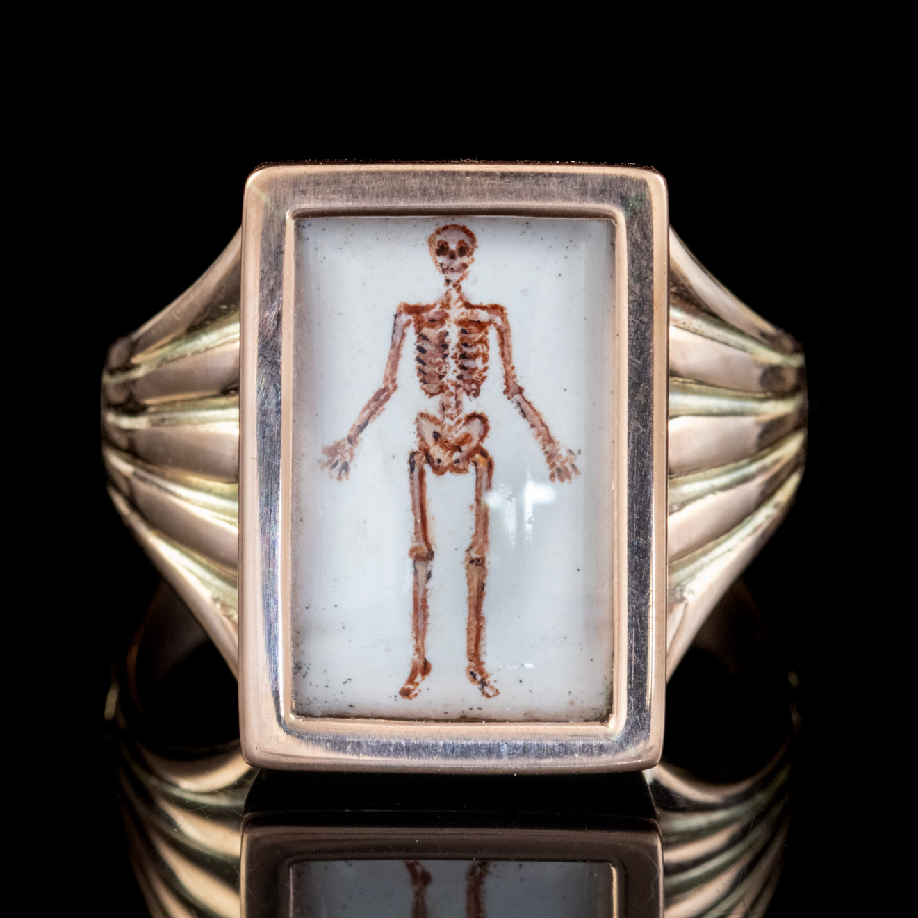 Memento Mori Enamel Skeleton Ring Antique Mount 9ct Gold