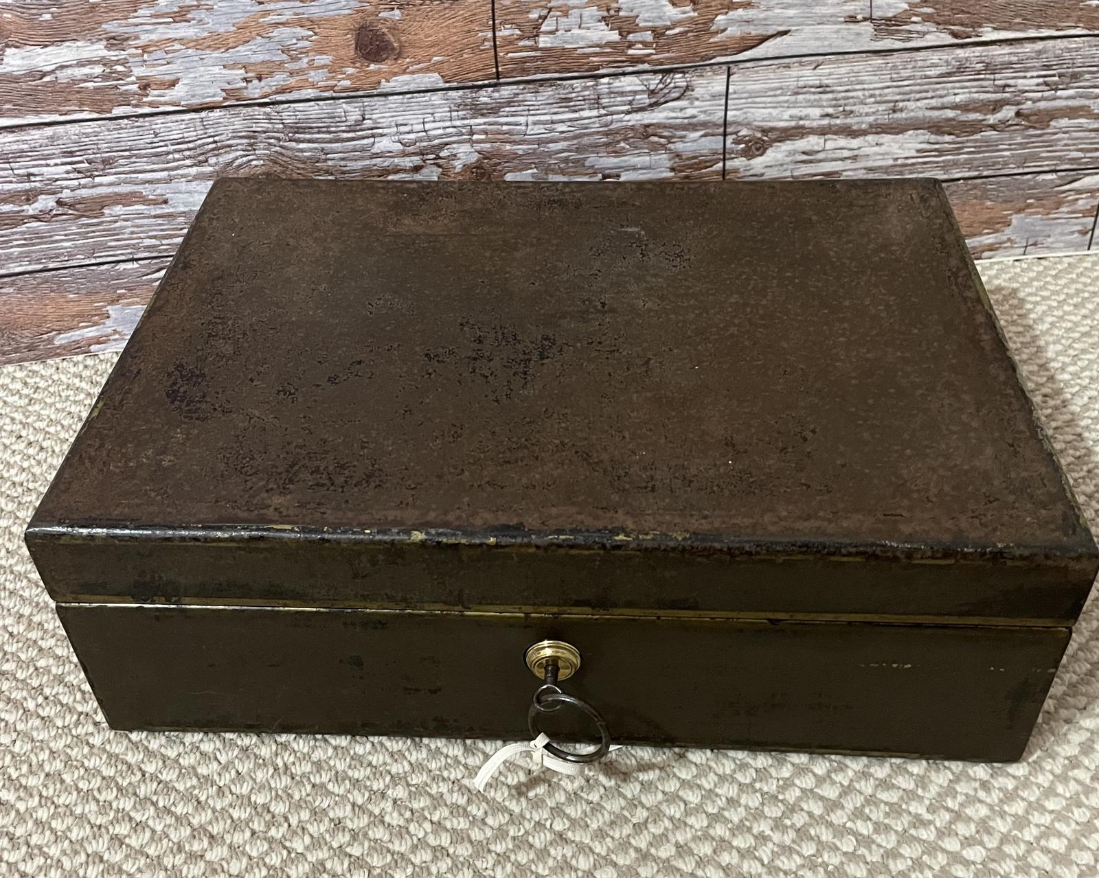 A metal "Strongbox" of travelling type with inset brass handles. "Snap shut" Bramah type lock, working with two keys. No internal tray, with a "drop down" compartment in lid.