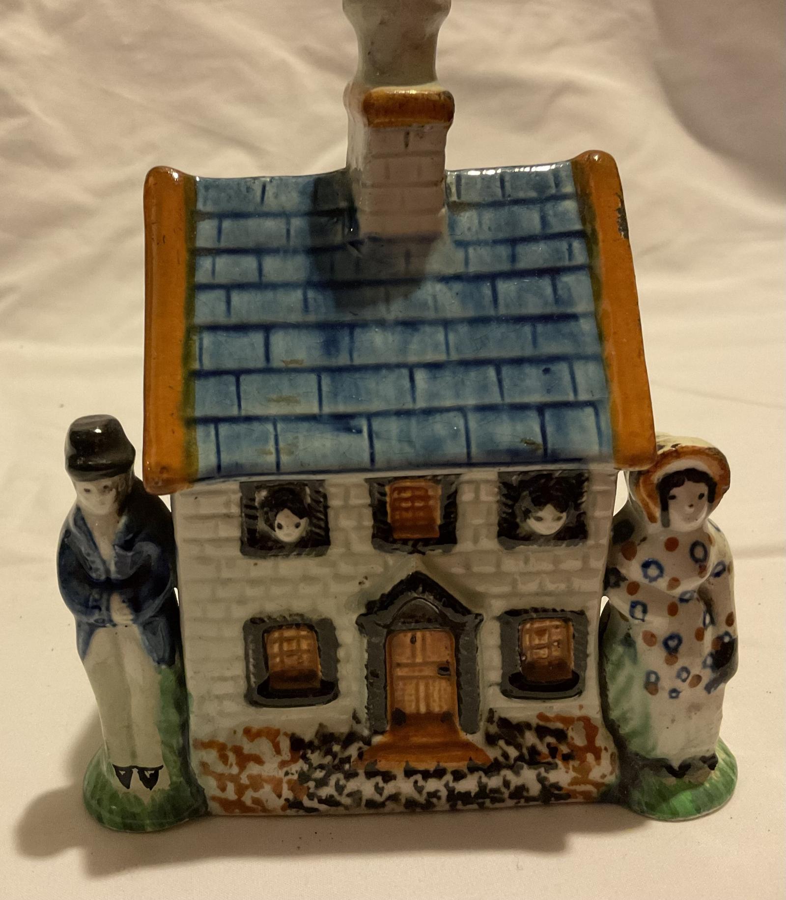A good Pearlware pottery cottage from the Mexborough factory prattware colours, it has two figures standing and two children’s faces at the window, the other version of this is the Methodist chapel. The condition is excellent no damage.