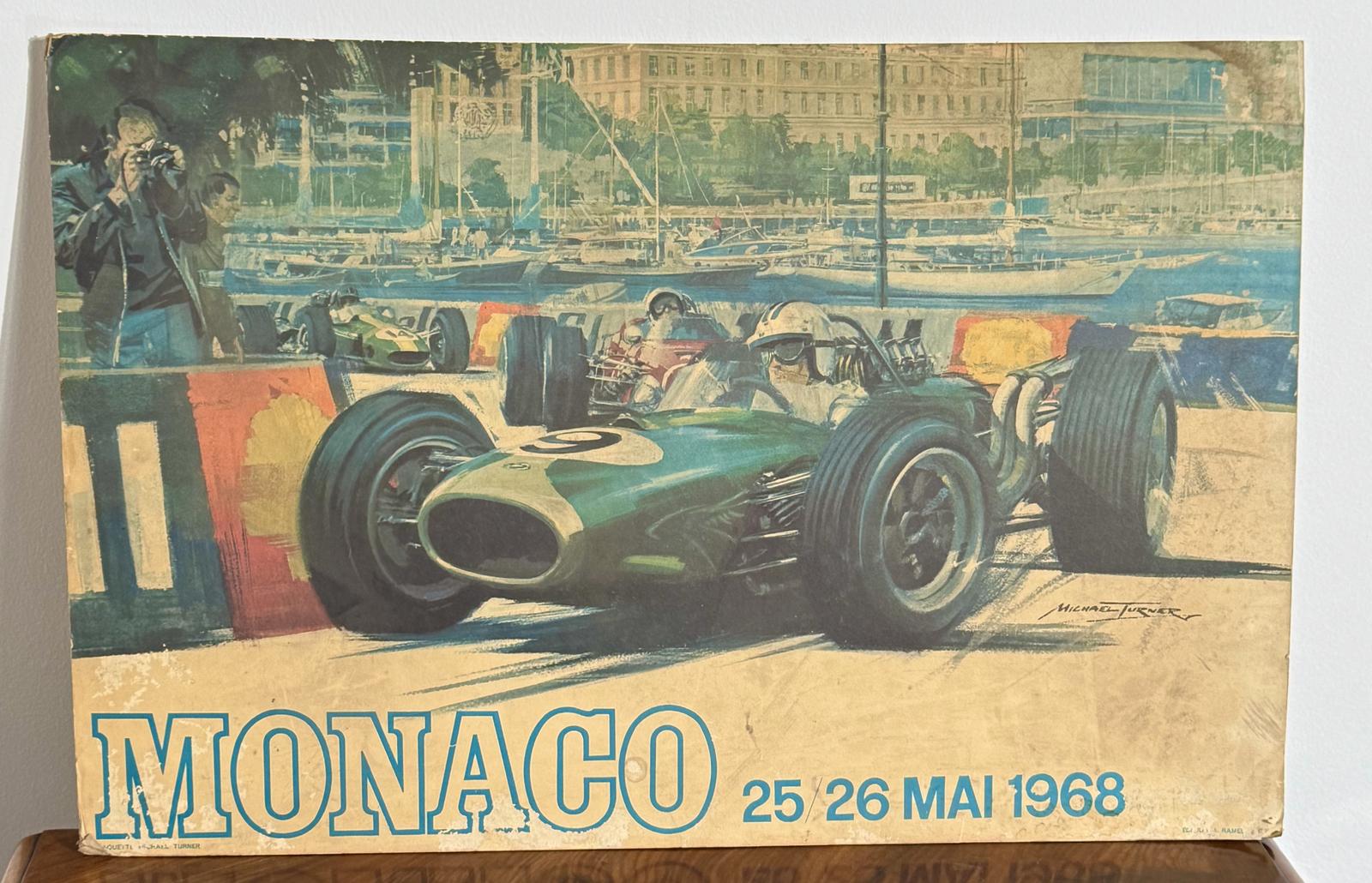 This rare poster created by Michael Turner in 1968, featuring a design associated with the Monaco Grand Prix. The poster is printed on card and showcases the artistic style of the late 1960s. It measures approximately 60cm by 40cm. The overall condition and any signs of wear or damage should be assessed by studying the photos.