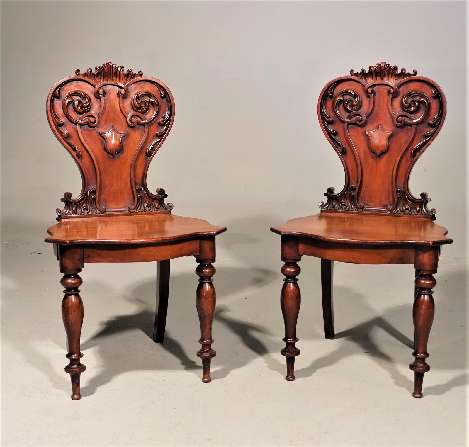 Mid 19th Century Pair of Well Carved Mahogany Hall Chairs