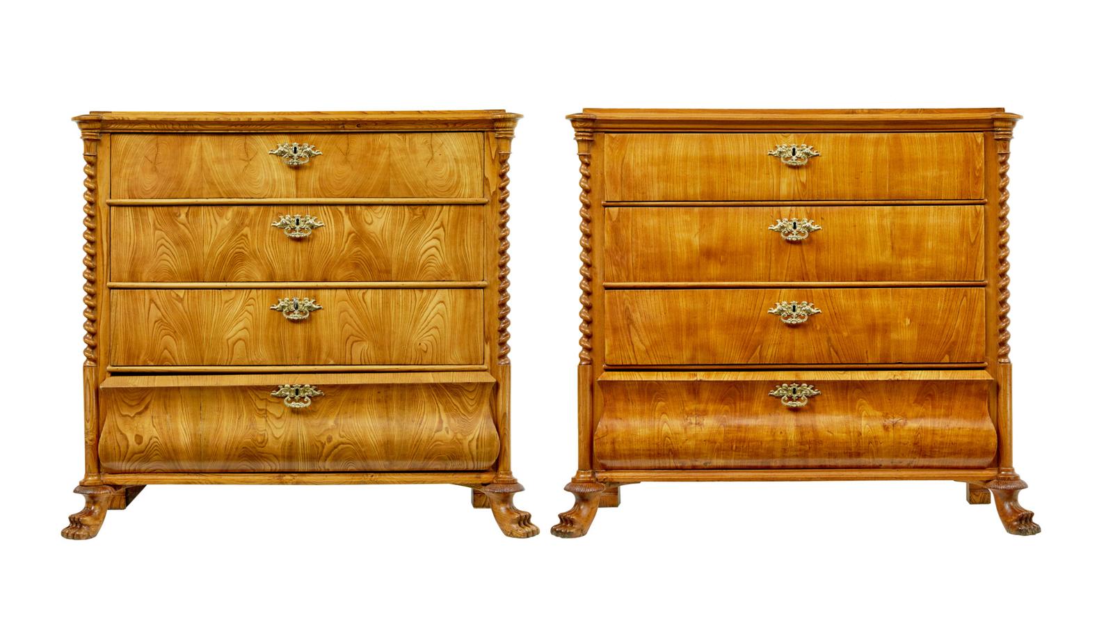 Fine quality pair of 19th century Swedish carved elm commodes circa 1850. Rectangular tops in book marked veneered elm, solid moulded edges and rounded corners which form the top of the candy twist hand carved columns which run down each side of the fronts of these chests. Each fitted with 3 drawers of equal proportions and a further shaped drawer on the bottom. Each drawer is fitted with an ornate ormolu handle which houses the keyhole as well. Working locks and key. Each standing on carved paw front feet and a block foot to the rear. Rare to find a pair of chests of these proportions still together.