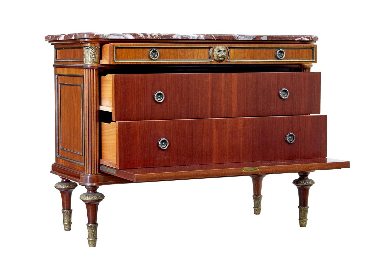 Good quality mid 20th Century (c.1960) mahogany marble top commode chest of drawers in the Rococo taste. Beautiful red and white marble top which is loose fitted. Single drawer below the top surface with 2 ring handles, brass moulding and a decorative lions head to the centre. Drop down front to reveal a further 2 fitted drawers. Decorated profusely with cast brass swags. Further brass moulding to the sides. Standing on turned feet with brass mounts. Ideal for use in multiple rooms around the home. Good rich colour, very minor surface marks from use.