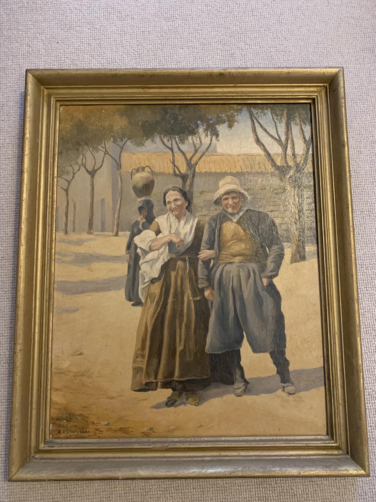 Mid 20th Century Oil on Board European School Painting of Sardinian Peasants by A.H. Norregaard