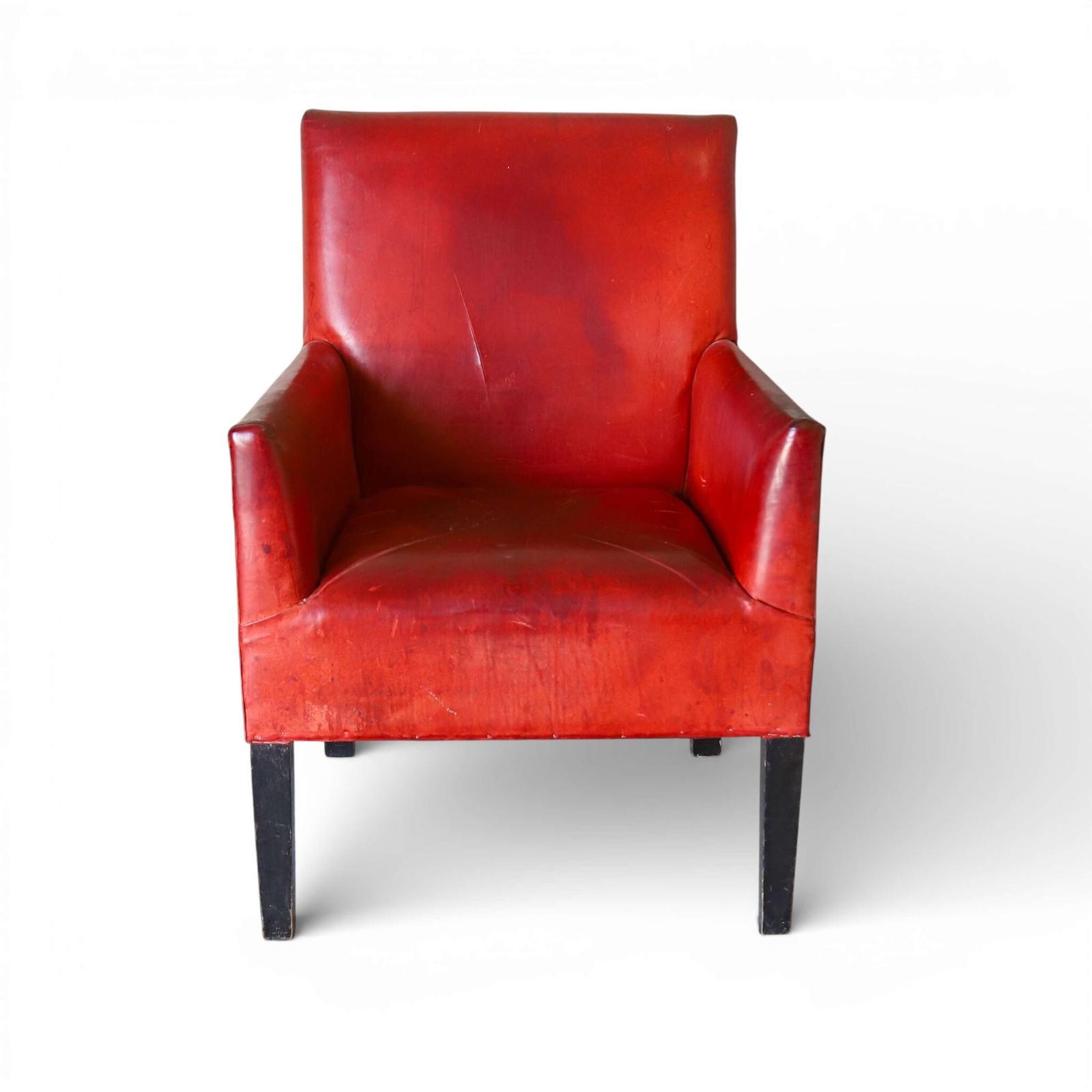 Mid 20th century red leather armchair with ebonised legs and beautifully worn patina