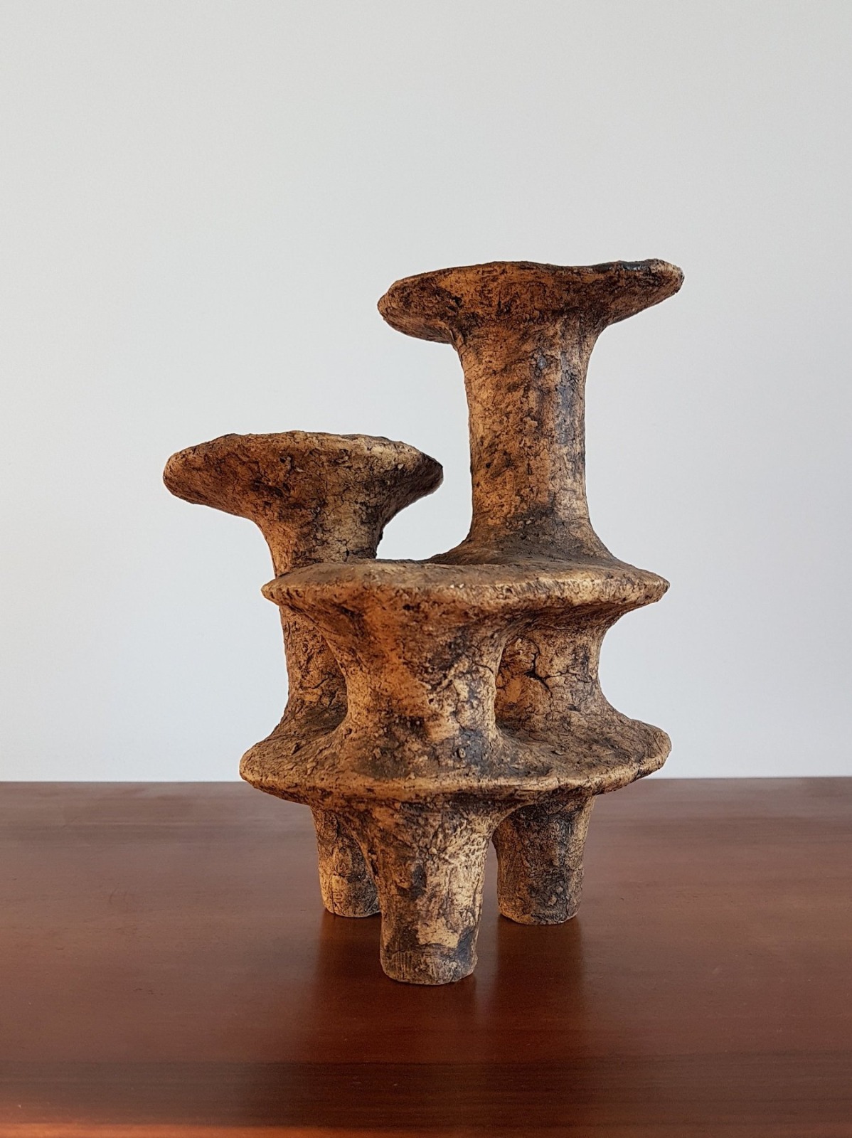 Mid Century Brutalist Studio Stoneware Pale Brown & Black Mushroom Chimney Sculpture