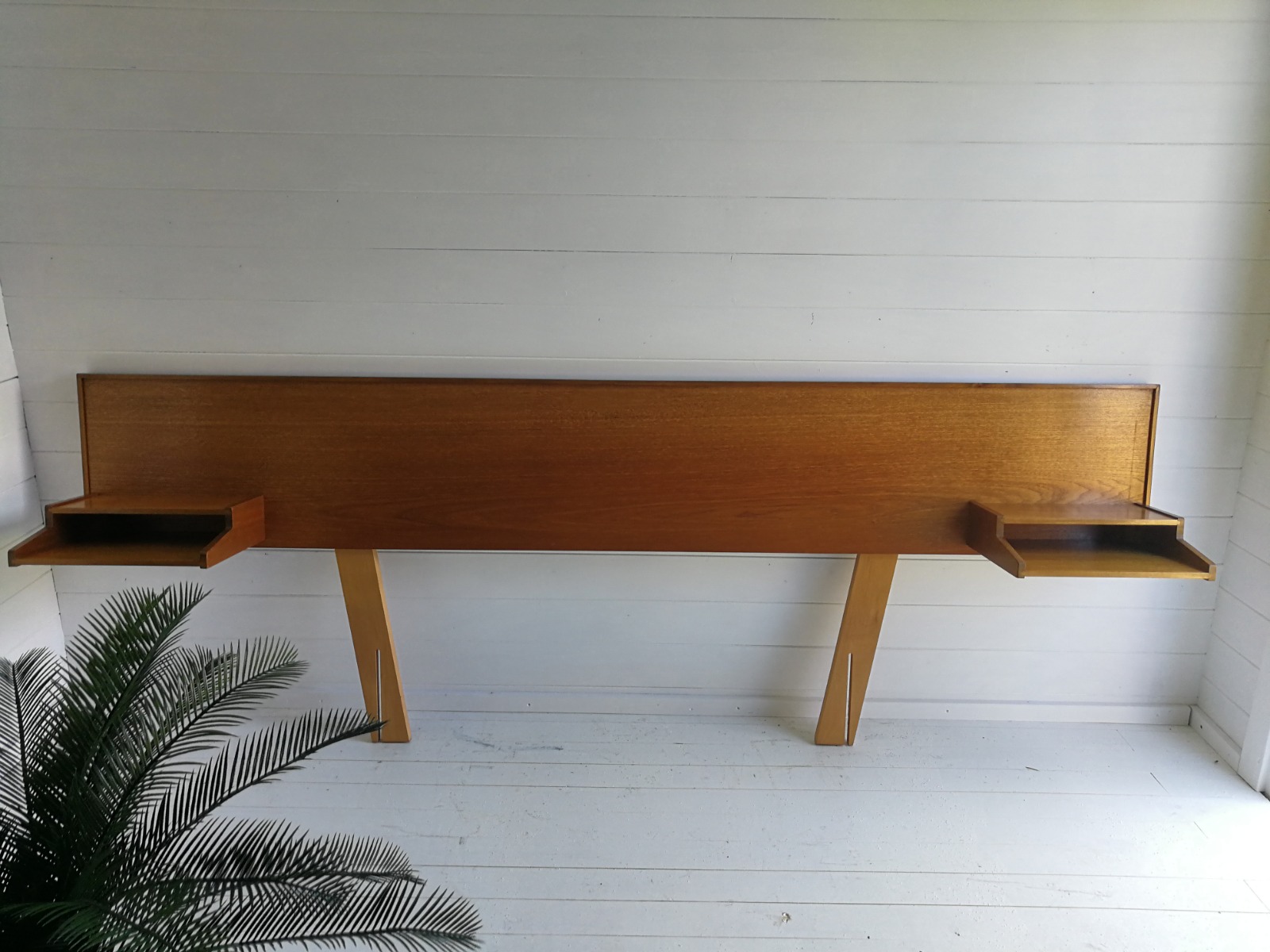 Mid Century Danish Style Restored Teak Double Headboard with Floating Nightstands, 1970s