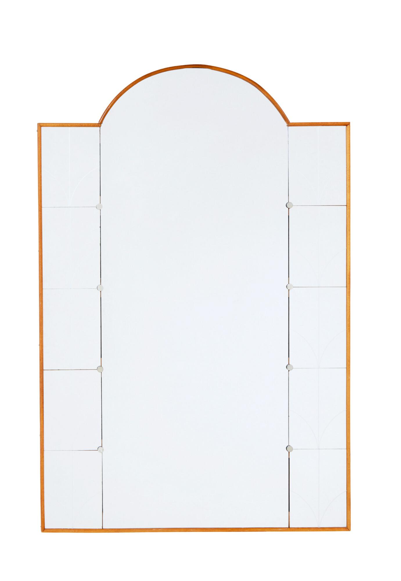 Mid century domed and etched mirror likely to be by glas & tra circa 1950. Different from the normal mirror of this type and period. Feature a shaped dome top, 1 piece main panel with a border on each side of 5 panels. each with an etched design. All held in place by chromed screw in studs. Presented in a beech frame. Solid pine backboard. Ideal mirror for the bathroom or bedroom. Wired for a portrait hanging position. Minor plate fading, very minor surface marks to woodwork, minor gaps between moulding, minor plate fading in line with a vintage mirror.