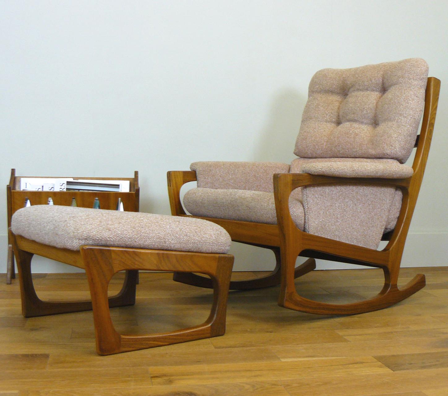 Mid Century Gimson and Slater Teak Rocking Armchair and Stool