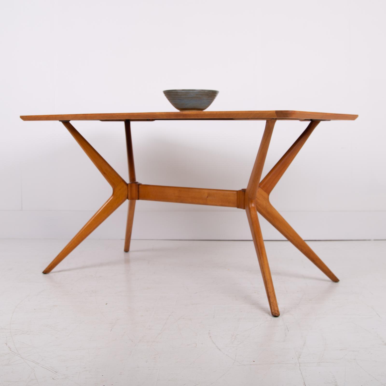 We have a Mid Century G-Plan 'Helicopter' table/desk featuring a teak top with a teak sculptural base. The angled, splayed legs connect through a central stretcher, creating a striking silhouette that exemplifies Mid Century British design.