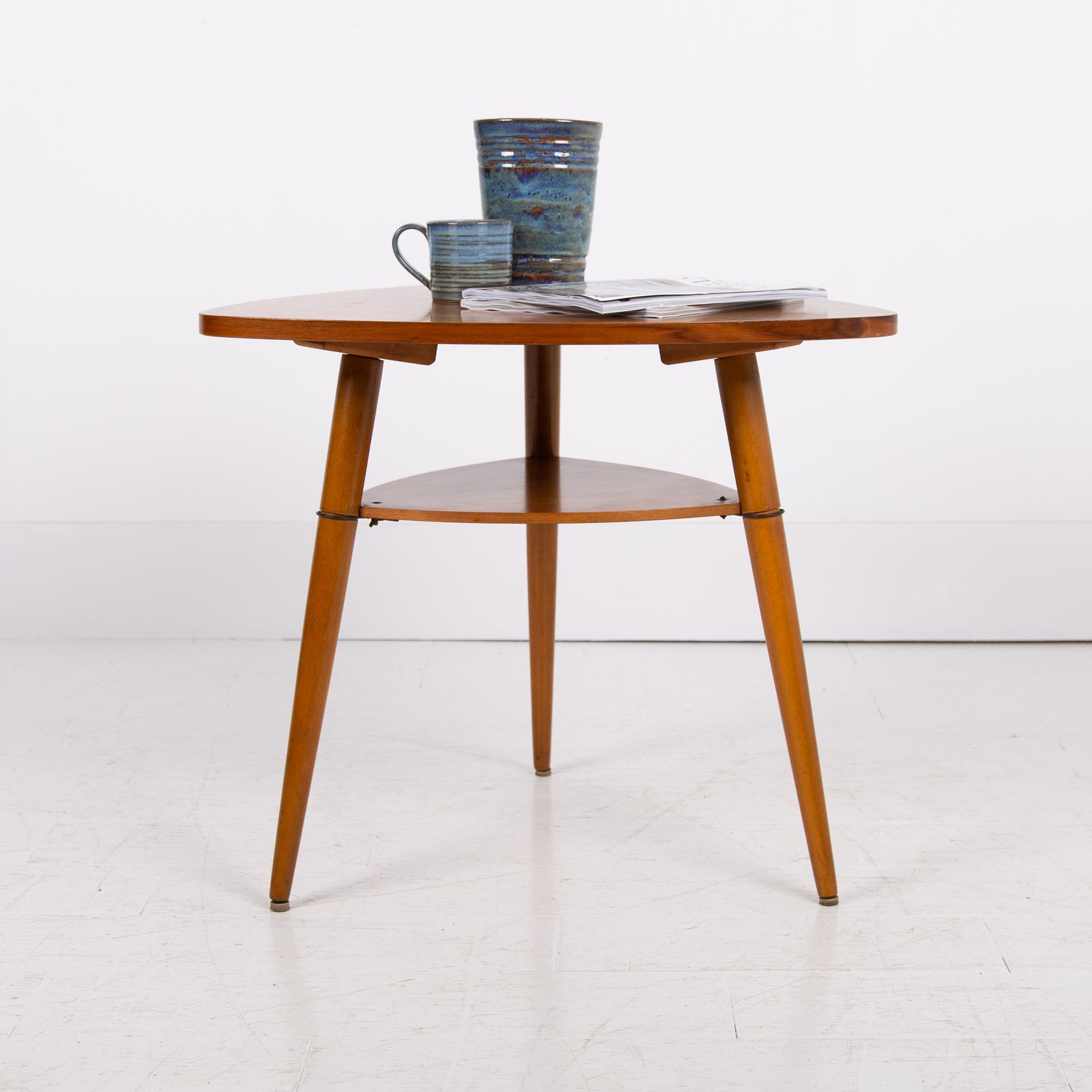 A lesser seen Mid Century piece of good scale with its attractive shape. Nice veneer to the top and liking the use of brass rings to attach the lower magazine shelf. It sits in the right kind of condition with light day to day marks, no repairs or wobbles. We have ensured the table is ready to place.