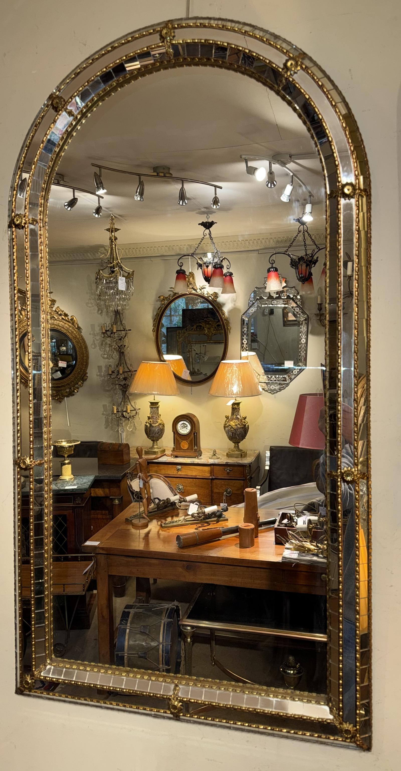 Offered for sale is this Spanish mid century arched top mirror, with applied gilded brass decoration and bordered by segmented glass borders. Very decorative and all in excellent condition.