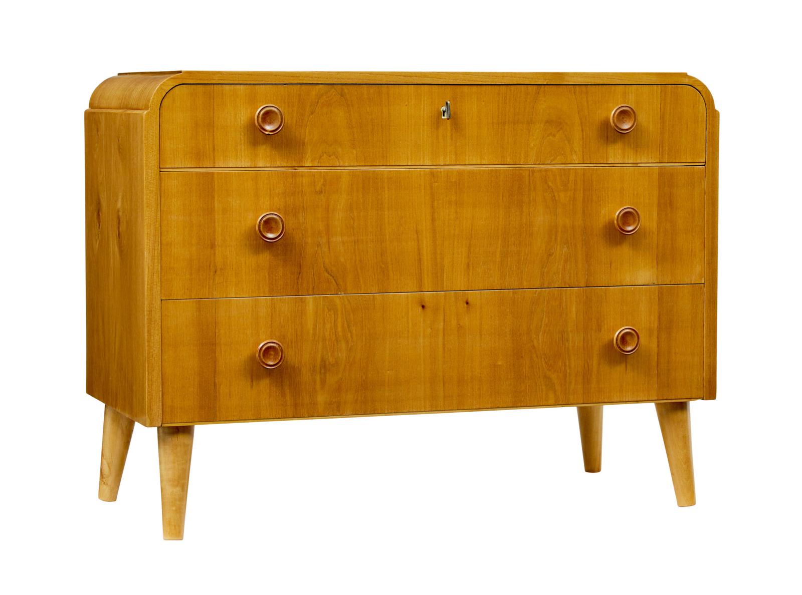 We are pleased to offer this fully restored mid 20th Century (circa 1940) Swedish elm chest of drawers which echoes strongly with the Art Deco period. Veneered in a striking elm having it's golden glow retained. Top with shaped ends and a very slight birch moulding, fitted with 3 graduating drawers each fitted with turned knobs in the same wood. Standing on 4 tapered legs. Ideal chest of drawers for multiple rooms around the home. Restoration to minor age splits on top surface and restoration to minor losses to woodwork. Minor surface fading. Fully restored in our workshop and French polished by hand.