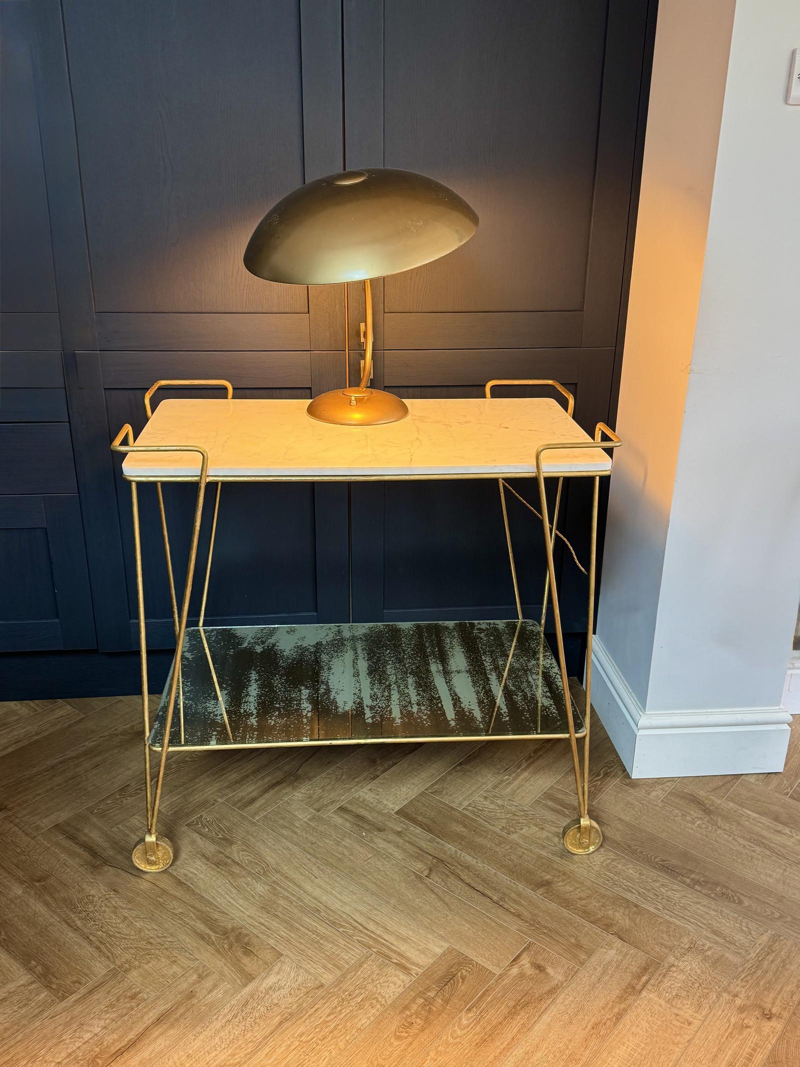 This gilded metal trolley has a heavy marble top and a smoky effect to the glass on the under tier. Very glamorous for a tea trolley so maybe it was made to be a drinks trolley.