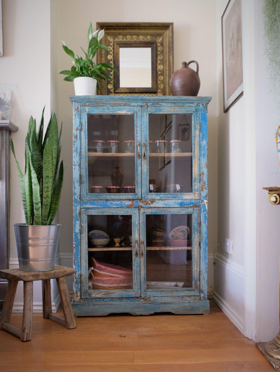 Mid Height 4 Door Glass Cabinet with Old Blue Paint