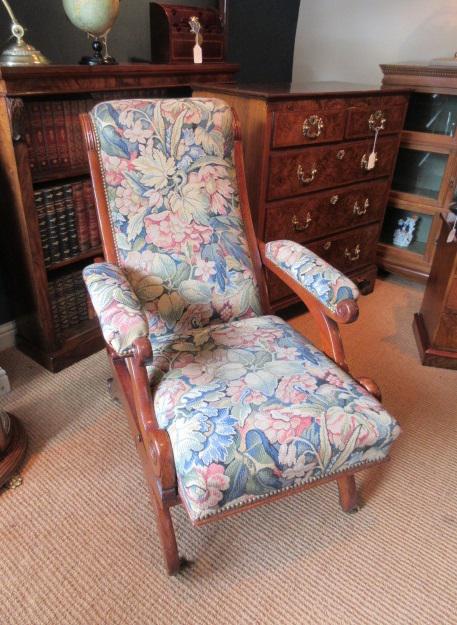 Mid Victorian Walnut Upholstered Reclining Armchair