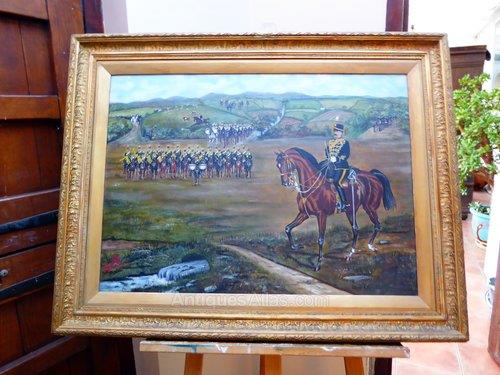 Military Oil Painting of Kings 8th Royal Irish Hussars Regiment & Commanding Officer On Horseback C.1897 (1 of 6)