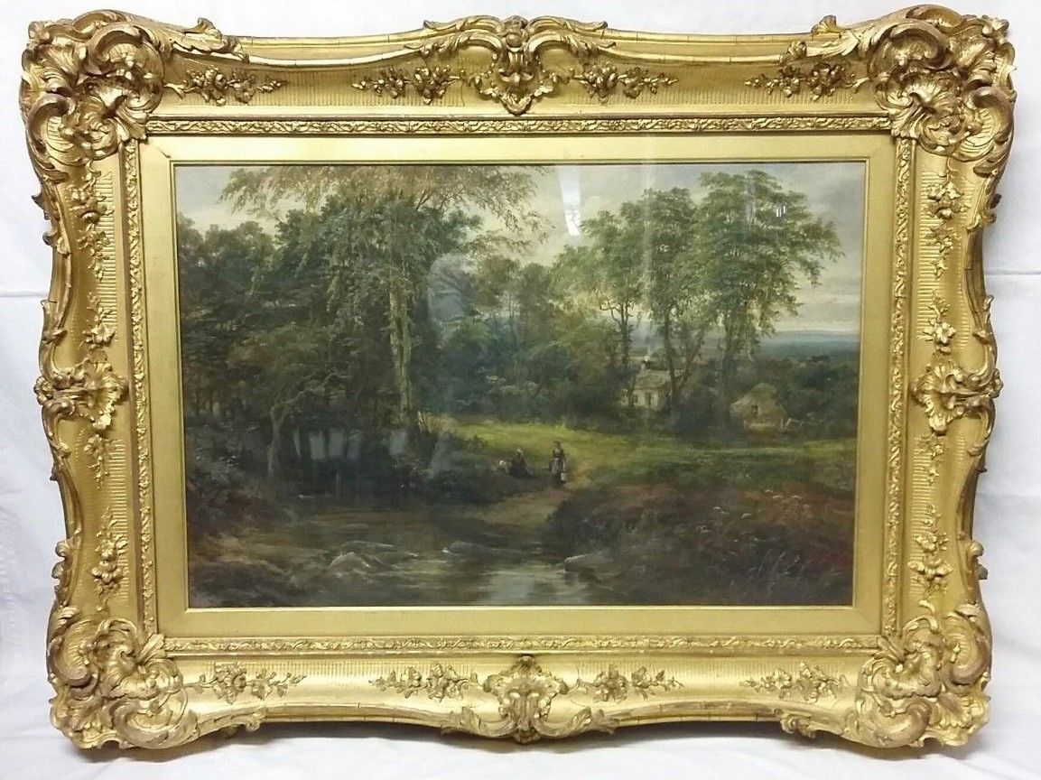 'Millstream Llanguyre' Large Oil on Canvas Landscape Painting c.1890