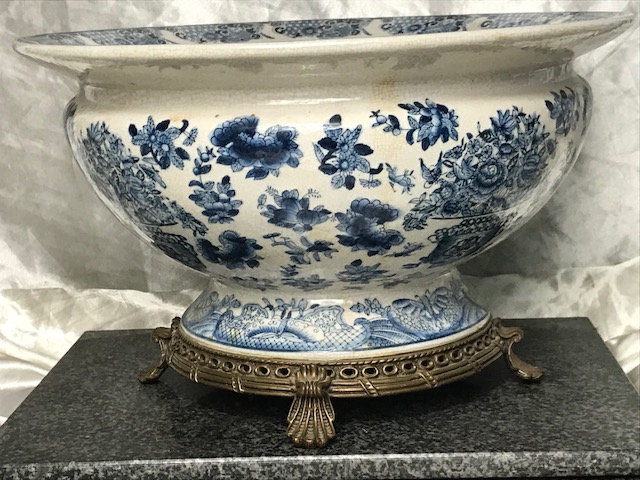 Ming Style Blue & White Porcelain Centrepiece Bowl with Bronze Base Legs (1 of 1)