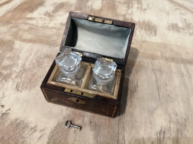 Miniature Leather Trunk Containing a Pair of Clear Glass Scent Bottles
