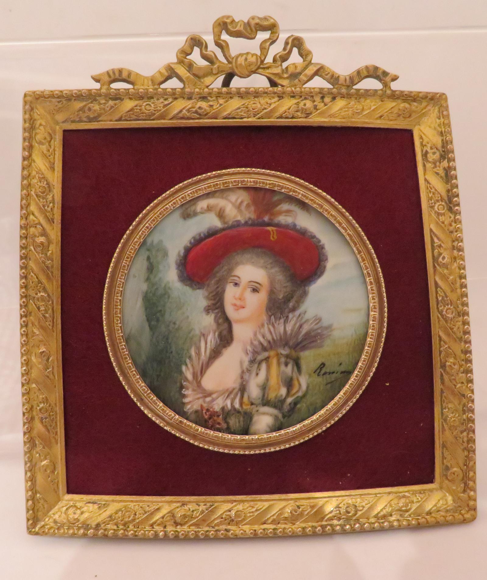 Miniature Portrait Lady of the French Court Square Gilt Frame 1880