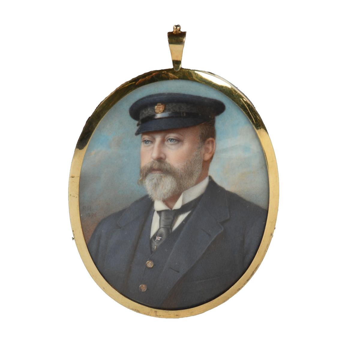 Miniature oil on ivory in 14K gold case of King Edward VII (1841–1910) in uniform as Captain of HMY “Britannia”, a gaff-rigged cutter yacht built in 1898 (note burgee tie pin, initialed “RH” over his right shoulder), dated 1896 and inscribed on backing paper: