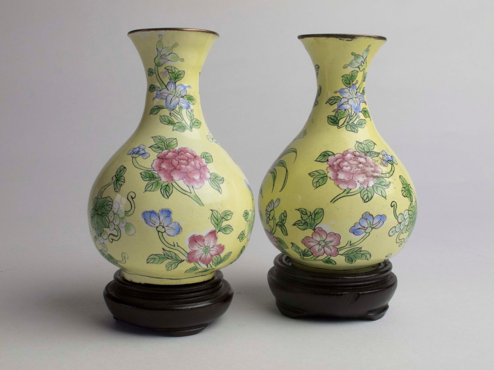 Mirror Pair of Small Canton Enamel Vases