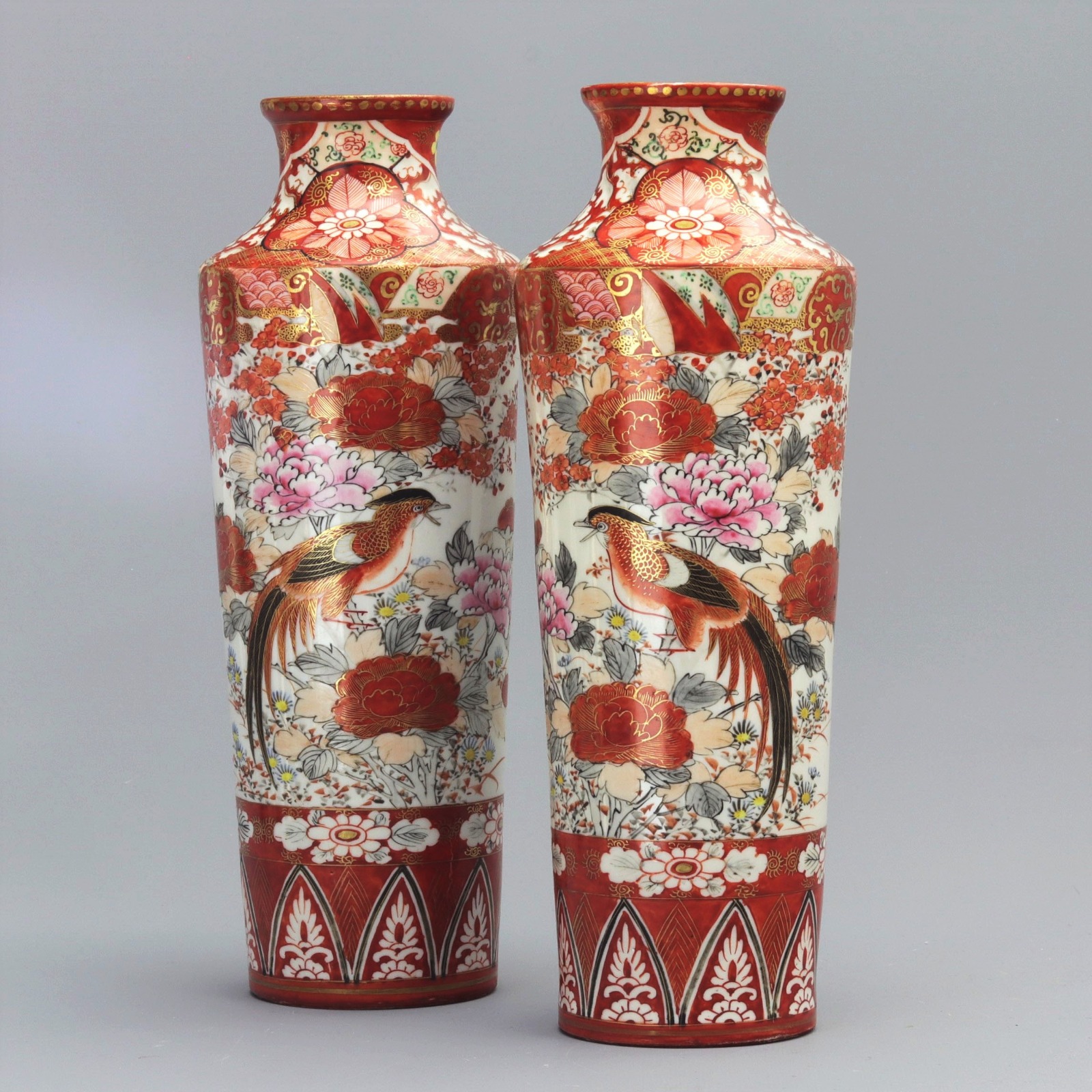 Mirrored Pair of Japanese Meiji Period Kutani Vases with Exotic Birds c.1890