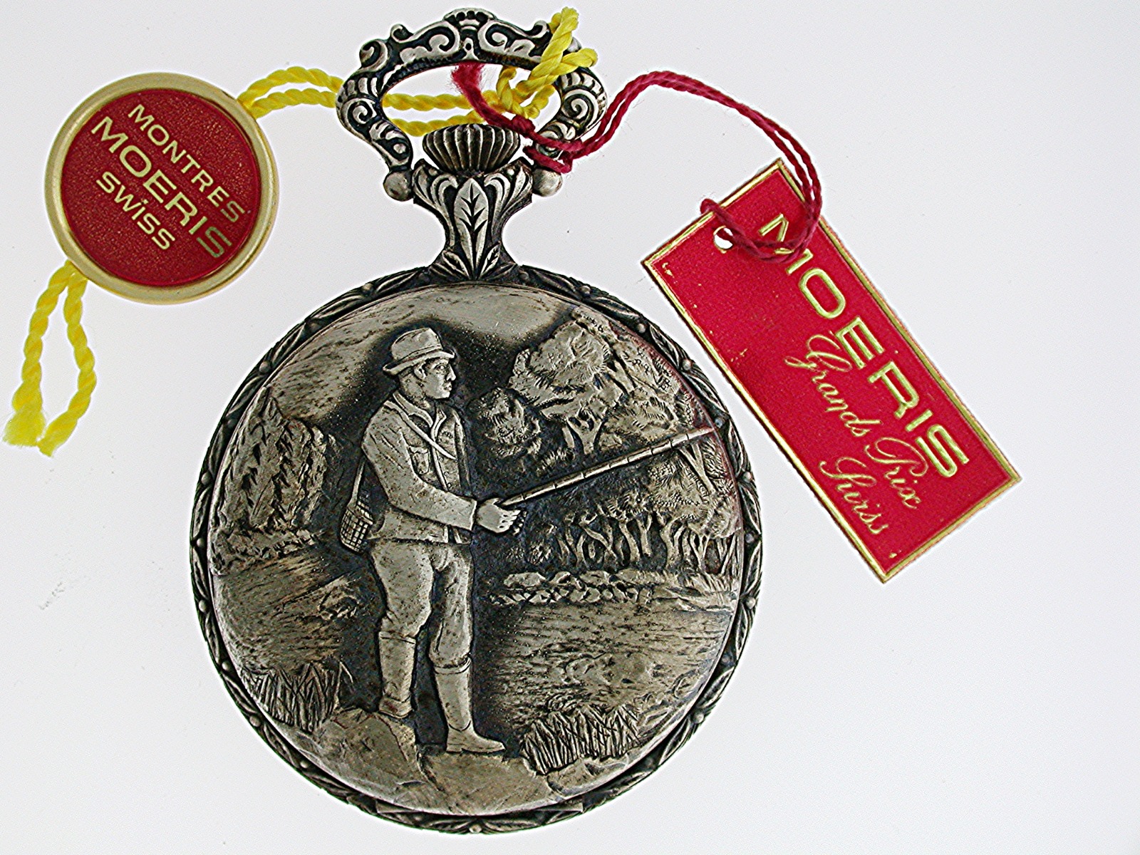 Moeris Nos Full Hunter Pocket Watch with Fisherman on Case Swiss 1960