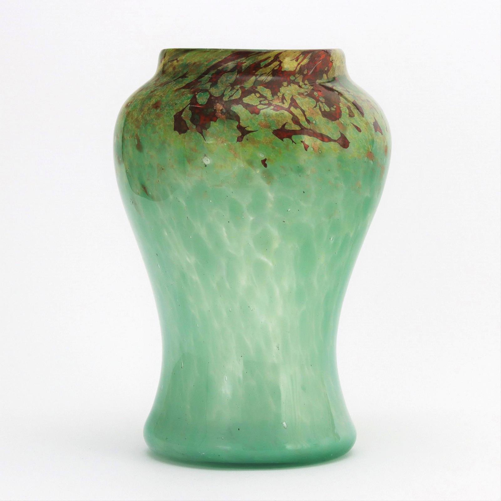 Monart Art Glass Vase in Sea-Green and Red with Gold Aventurine c1930