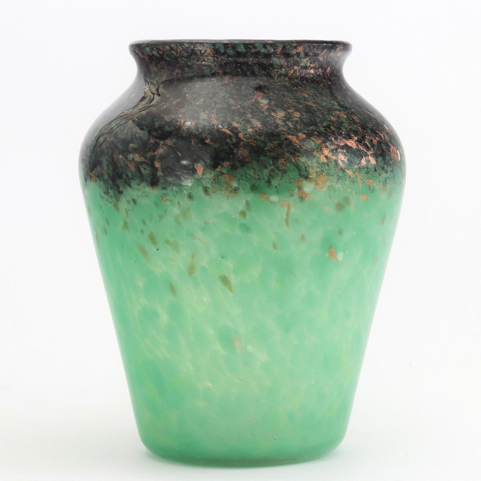 Monart Glass Vase in Celadon & Black with Bronze Aventurine c.1930