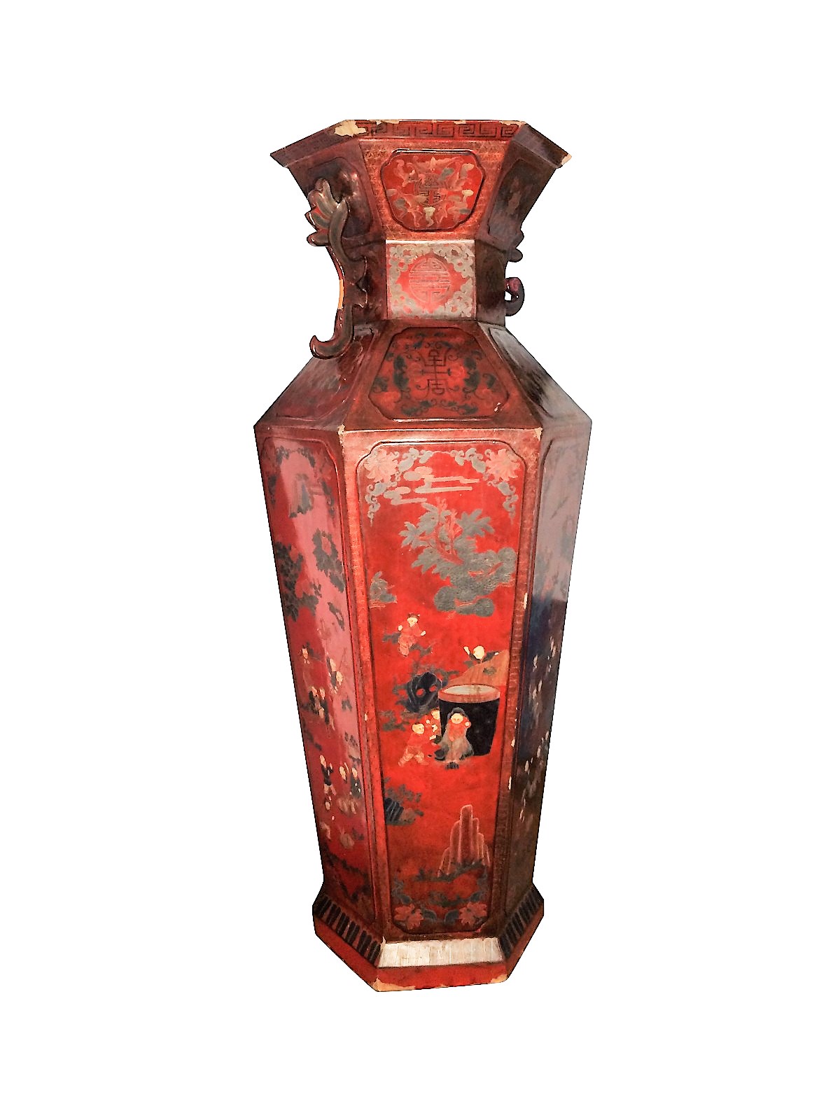 Monumental Pair of Hexagonal Chinese Red Lacquer Baluster Vases